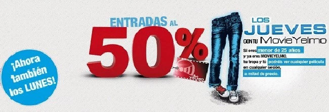 Seguimos hablando de ofertas de Yelmo cines y si ayer se trataba de una para fines de semana y destinada a los más pequeños de la casa, hoy es una promoción pensada para los menores de 25 años, que los lunes y los jueves pueden ir a estos cines comprando su entrada a mitad de precio. Como decimos, todo un lujo tal y como están los precios.