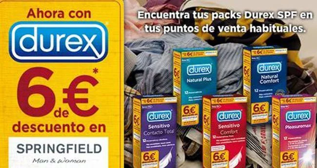 Te llevas a casa una caja de preservativos Durex de 12 unidades y de regalo... ¡cheque descuento! Se trata de una rebaja de 6 euros en todas las tiendas Springfield, que a mí me parece que está bastante bien. Nos viene de perlas para estas navidades, para esos regalos que ya deberíamos ir empezando a planificar.