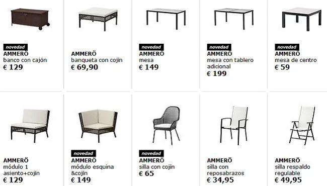 Para equipar nuestro jardín la cadena de muebles Ikea ha diseñado un surtido muy variado de mobiliario de exterior a unos precios muy reducidos. Dentro de esta promoción podemos encontrar: sombrillas, toldos, textiles resistentes al exterior, macetas, plantas, e iluminación decorativa, con la que podemos dar un cambio de imagen a nuestra terraza o jardín por muy poco dinero.