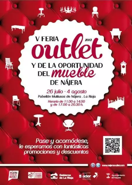 La Feria del Outlet del Mueble de Nájera, en La Rioja, se celebrará del 25 de julio al 3 de agosto, la feria contará con 16 firmas y se celebrará en el pabellón multiusos Ciudad de Nájera. Su horario será de 11 a 14 horas por las mañanas y de 17 a 20.30 horas por las tardes.