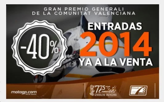 En su web oficial circuitvalencia las entradas tienen un descuento del 40 %. La fecha del Gran Premio Generali de la Comunitat Valenciana 2014 será del 7 al 9 de noviembre.