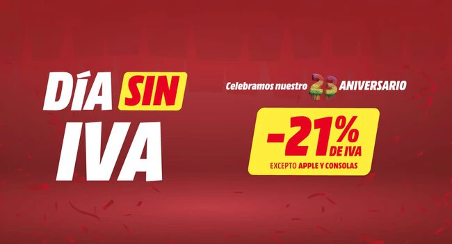 Durante el día de hoy, en MediaMarkt, puedes ahorrarte el IVA en electrodomésticos, portátiles, televisores, smartphones y muchos más productos. Excepto Apple y consolas, todos sus productos tienen un descuento equivalente al 21% de IVA incluido en el precio.