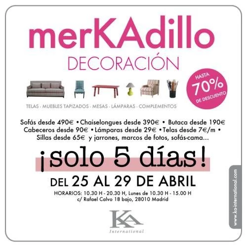 Traemos buenas noticias para los amantes de la decoración o para aquellos que les gusta tener la casa bonita y por poco dinero, Ka Internacional monta mercadillo en Madrid. Empieza mañana mismo y estará vigente hasta el día 29 de abril.