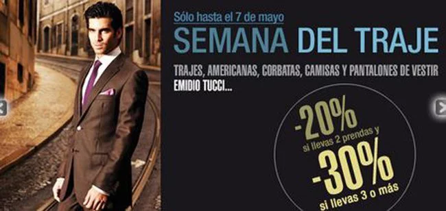 Se trata de 'La semana del traje', que estará activa hasta el 7 de mayo y que permite disfrutar de hasta un 30% de descuento directo. Es una muy buena oportunidad para llevarnos a casa a mejor precio prendas muy básicas como trajes, americanas, corbatas, camisas o pantalones de vestir.