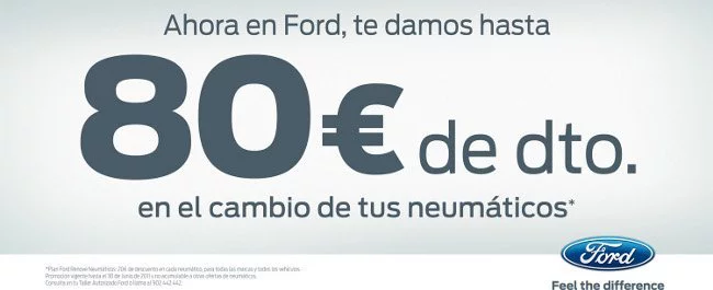 ¿En qué consiste? Pues se trata de que hasta el próximo 30 de junio todos los clientes de Talleres Autorizados Ford podrán disfrutar de un descuento de hasta 80 Euros en el cambio de sus neumáticos. Además, esta campaña es compatible con la Renove del Ministerio de Industria, por lo que el descuento total puede llegar a ser de 160 Euros. Muy interesante.