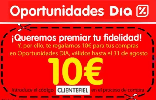 Para los clientes habituales serán 10 euros de descuento al realizar sus compras en la web de oportunidades DIA, válido hasta el domingo día 31 de agosto y con el código CLIENTEFIEL.