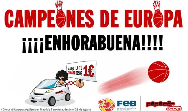 Recientemente nos hemos coronado nuevamente como campeones de Europa en baloncesto de la mano de nuestra selección, y la empresa de alquiler de automóviles Pepecar nos ofrece alquilar un Smart por 1 euro al día. Bueno, en realidad a partir del segundo día son 8 euros, IVA incluido, y con un kilometraje muy limitado, que no debe superar los 40 kilómetros a la jornada, no dando para grandes desplazamiento.
