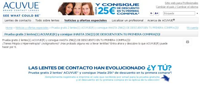 Tanto si eres una persona que tienes miopía, hipermetropía o astigmatismo podrás probar este producto con este sencillo paso, la marca ACUVUE se ajusta a tus necesidades. ¡Pruébalas ahora y consigue también hasta 25€ de descuento en tu primera compra!