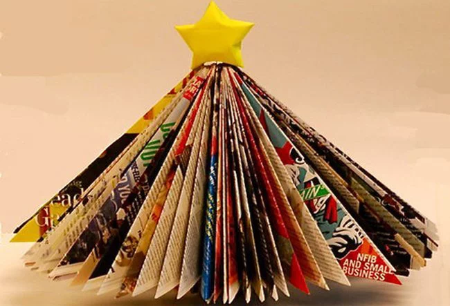 Para que me quede este arbolito de navidad tan mono, lo único que tengo que hacer es coger la revista e ir doblando las páginas una a una de manera triangular, hasta darle esa forma y que se mantenga en pie. Y luego la decoración en la punta con cualquier adorno que tengamos por casa o una estrella como la de la foto, que podemos hacer nosotros mismos con papel y un poco de pintura. ¿Queda o no queda estupendo?