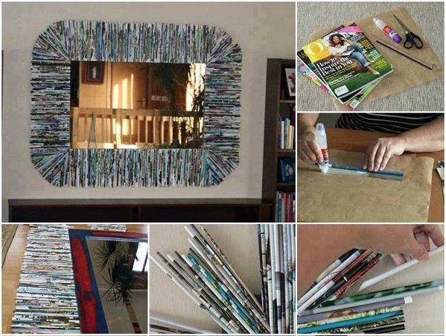 Una buena idea para darles uso es este marco para un espejo que puede quedar muy decorativo en cualquier rincón de nuestra casa. Como vemos en la imagen, es muy fácil de fabricar. Con un poco de paciencia, tiempo libre y maña, se trata de ir enroscando las hojas y pegándolas unas y otras bien juntas hasta crear un marco. ¿Es o no es original?