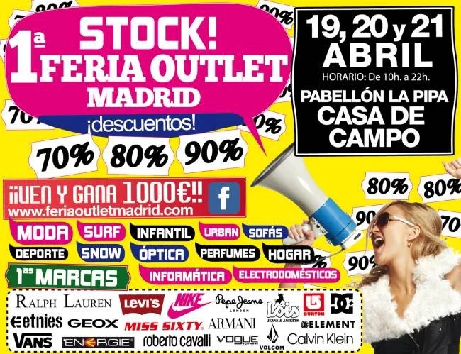 No es la primera vez que te hablamos en Ahorro diario de ferias para dar salida a stocks de marcas y hoy te traigo la que se celebra en Madrid este próximo fin de semana. La bautizan como Stock! Feria Outlet Madrid y estará ubicada en el Pabellón la Pipa en la Casa de Campo. Se celebrará los días 19, 20 y 21 y la causa común será que distintos comercios de diferentes sectores le den salida a su stock inmovilizado a precios como mínimo un 50% por debajo de su precio.