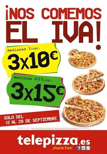 Consulta las tiendas adheridas a esta oferta gracias a la que puedes disfrutar de 3 medianas de 1 ingrediente por 10 euros o 3 medianas especialidad por 15 euros. Eso sí, esta promoción solo es válida en local o si recoges tu pedido en tu Telepizza más cercano después de llamar.