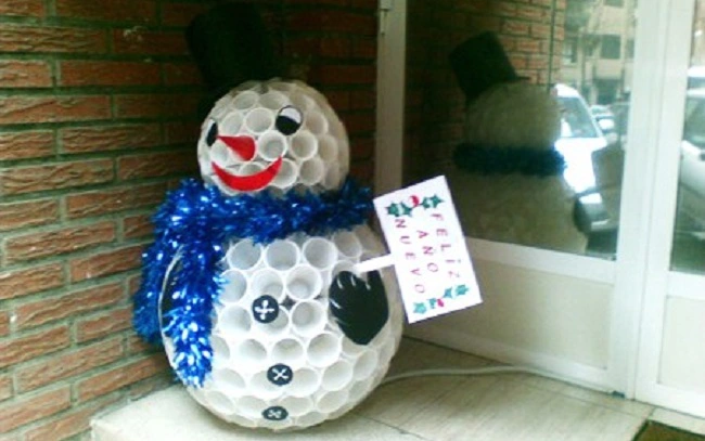 ¿Qué te parece este muñeco de nieve hecho con vasos de plástico? ¡Queda perfecto! Seguro que tienes paquetes medio abiertos por casa que sobraron de merendolas o de fiestas, lo único que tienes que hacer es pegarlos formando dos bolas y luego decorar con lo que se te ocurra.