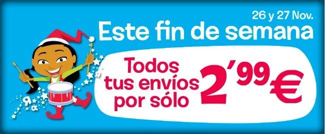 Al menos este fin de semana. Y no son a un euro como fueron en días anteriores, pero sí a 2,99 euros en todas tus compras, excepto para envíos especiales (que son productos voluminosos) y envíos express. Es una promoción exclusiva para península y baleares y válida solo para estos dos días, sábado 26 y domingo 27 de noviembre.