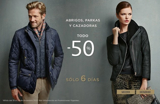 Podemos encontrarnos con abrigos, parkas y cazadoras a mitad de precio en todas sus tiendas físicas y en la tienda online, pero solo lo que queda del día de hoy y mañana, que aunque sea nochebuena, las tiendas siguen abiertas. Sin duda, un muy buen regalo.