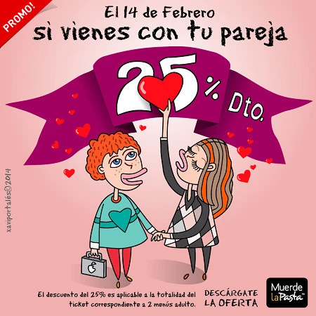 Se trata de Muerde la Pasta y su promoción de un 25 % de descuento para 'invitar' a tu pareja. Es decir, el descuento se aplicará al total de las dos cenas. Porque sí, encima es en cenas, que son más caras que las comidas. La oferta es válida solo el viernes 14 de febrero, y en un horario de 20:00 horas hasta las 23:00. Ni un 2x1, ni un 50 % al menos.