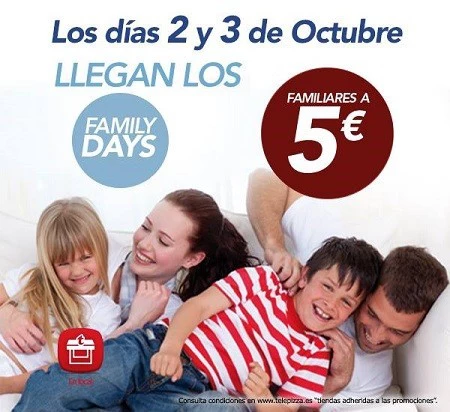 Hoy y mañana celebran los 'Family Days': una promoción especial en pizzas familiares por 5 euros. Eso sí, solo en local (pidiéndolas allí o recogiéndolas tú, pero no te las llevan a casa) y de un solo ingrediente: jamón, bacon, carne o champiñón. Si pagas 2 euros más, puedes hacerla especialidad.