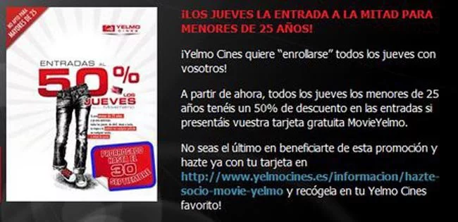 Yelmo Cines lanzó una interesante promoción a finales del mes de junio para que los menores de 25 años que tuvieran la tarjeta gratuita MovieYelmo consiguieran entradas de cine a mitad de precio. La cosa parece que ha funcionado bien y desde las oficinas de la cadena anuncian que han decidido prorrogar la oferta hasta el día 30 de septiembre.