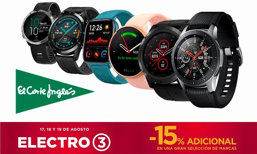 Para terminar de dar un repaso a las mejores ofertas del Electro 3 de El Corte Inglés hemos dejado los relojes inteligentes entre los que también podemos encontrar un buen puñado de precios interesantes. Samsung, Amazfit o Huawei tienen algunos modelos que seguro que te convencen y que ahora te podrás llevar con el 15% de descuento adicional, con envío gratis, o con la posibilidad de elegir la recogida en tienda o Click&Car. Te contamos más si sigues leyendo.