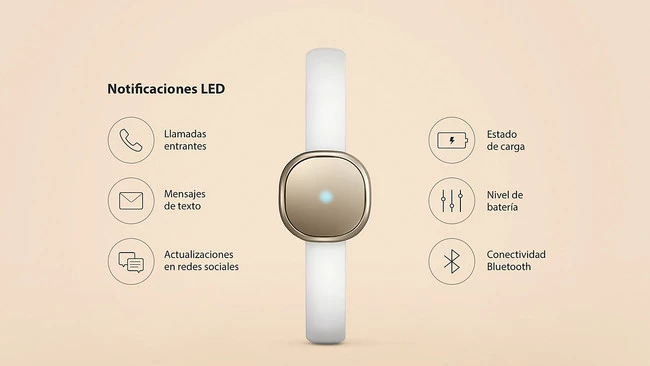 Esta pulsera de actividad se sincroniza con tu smartphone (únicamente Android, por lo que no te funcionará con iOS) mediante Bluetooth y nos avisará por medio de un indicador LED si recibimos una llamada, un SMS o alguna notificación en nuestras redes sociales.