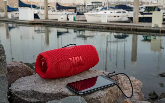 El JBL Charge 5 es un altavoz bluetooth con una impresionante batería de 7.500 mAh (te asegura hasta 20 horas de reproducción) y función de powerbank.