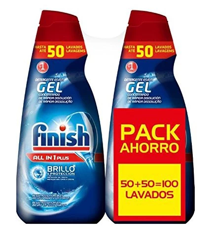 Este pack de Finish nos permite tener suficiente detergente para lavavajillas en gel concentrado para 100 usos, lo que provoca que si ponemos el lavavajillas una vez al día tengamos para más de tres meses de uso. Este detergente de rápida disolución ofrece brillo y protección para la cristalería, siendo eficiente tanto para ciclos largos como cortos. Como se puede ver en la imagen superior vienen dos botes de 50 dosis cada uno.