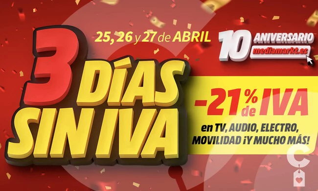 Vuelven los Días sin IVA a MediaMarkt dentro de la campaña por el aniversario online de la cadena alemana. Por delante y hasta el día 28 a las 9:00 de la mañana, tienes ofertones que no podrás dejar escapar. Eso sí, mejor darse prisa, porque en este tipo de campañas, las existencias vuelan. Sigue leyendo para conocer las mejores ofertas.