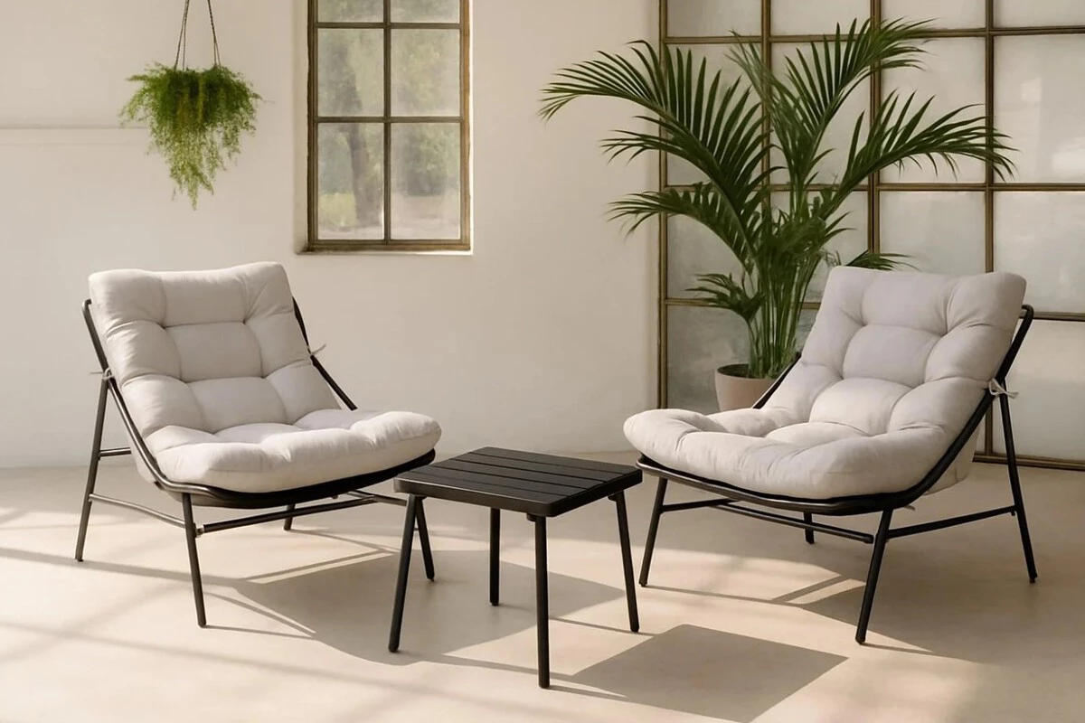 Los cojines de ambos sillones (que vienen incluidos) están confeccionados en olefina. Aunque este material no es muy conocido, se trata de una fibra de tacto suave y ligero que es ideal para exteriores.