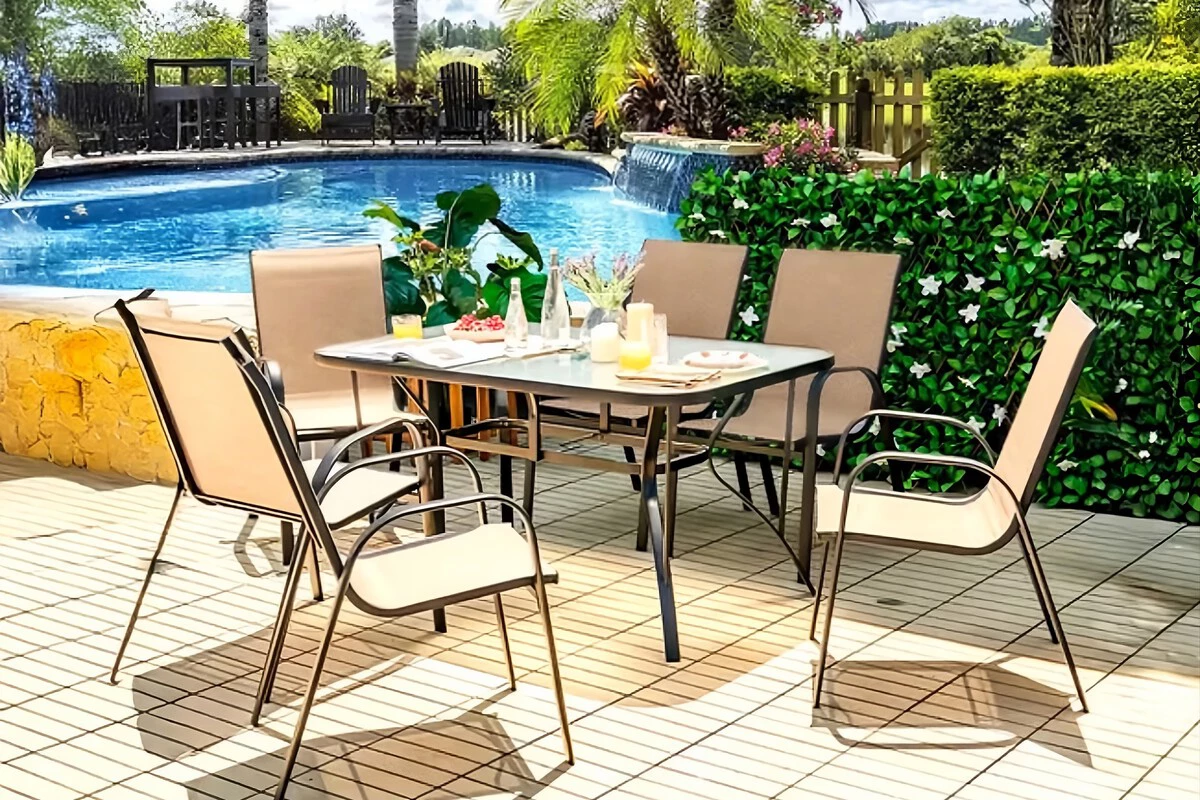 Está formado por una mesa grande de cristal templado y 6 sillas con reposabrazos que mejoran la comodidad además de respaldos de tela fáciles de limpiar. Todas las patas tienen acabados de caucho que no dañan al suelo pudiéndose guardar en cualquier parte o incluso tenerlos todo el año tapados si no tienes espacio.