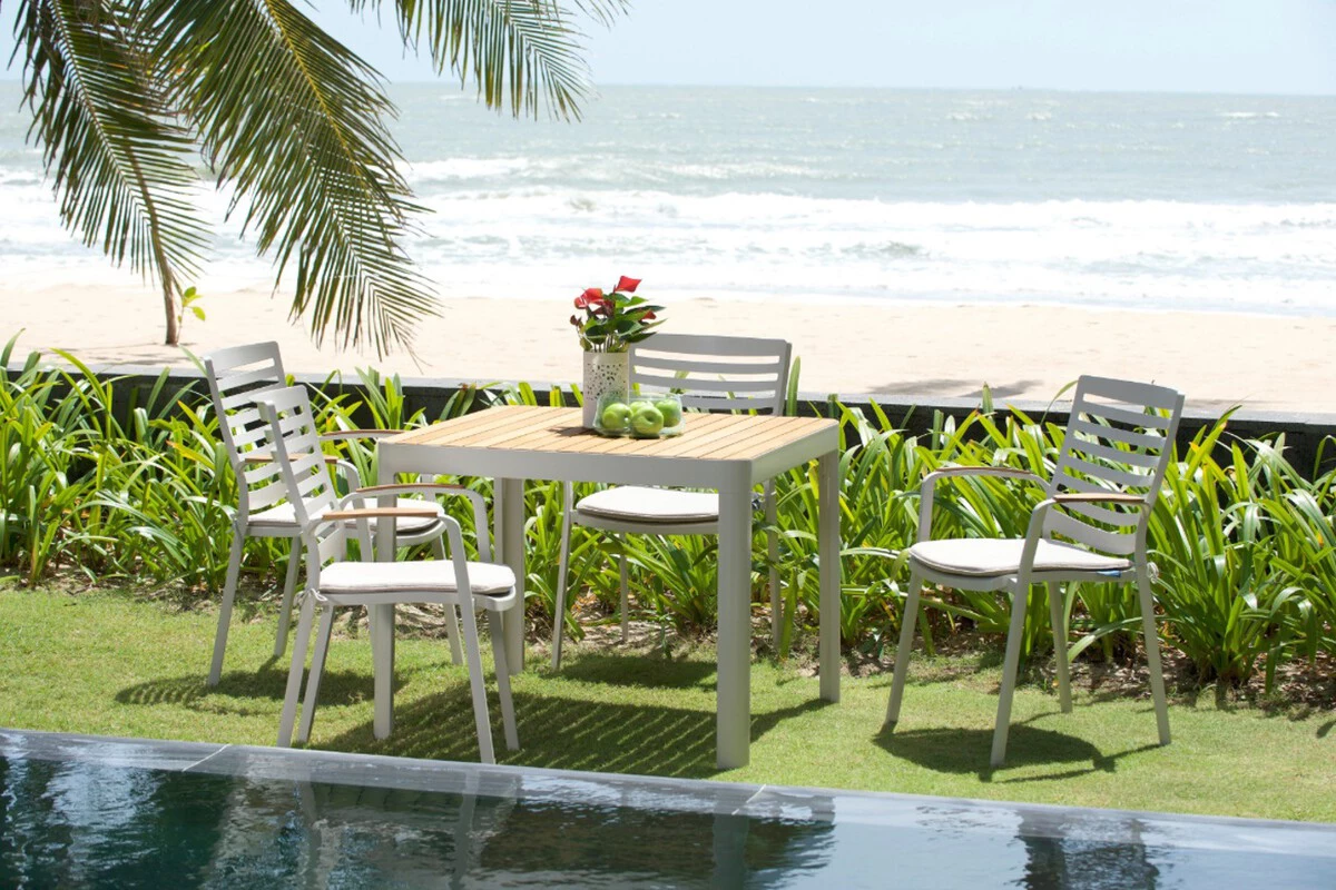 Un detalle a destacar, es que las sillas son apilables, lo que facilita su almacenamiento y ocupando poco espacio cuando no se estén utilizando. Además, su estructura está fabricada en aluminio y madera de teca, por lo que es resistente a la corrosión y al paso del tiempo.