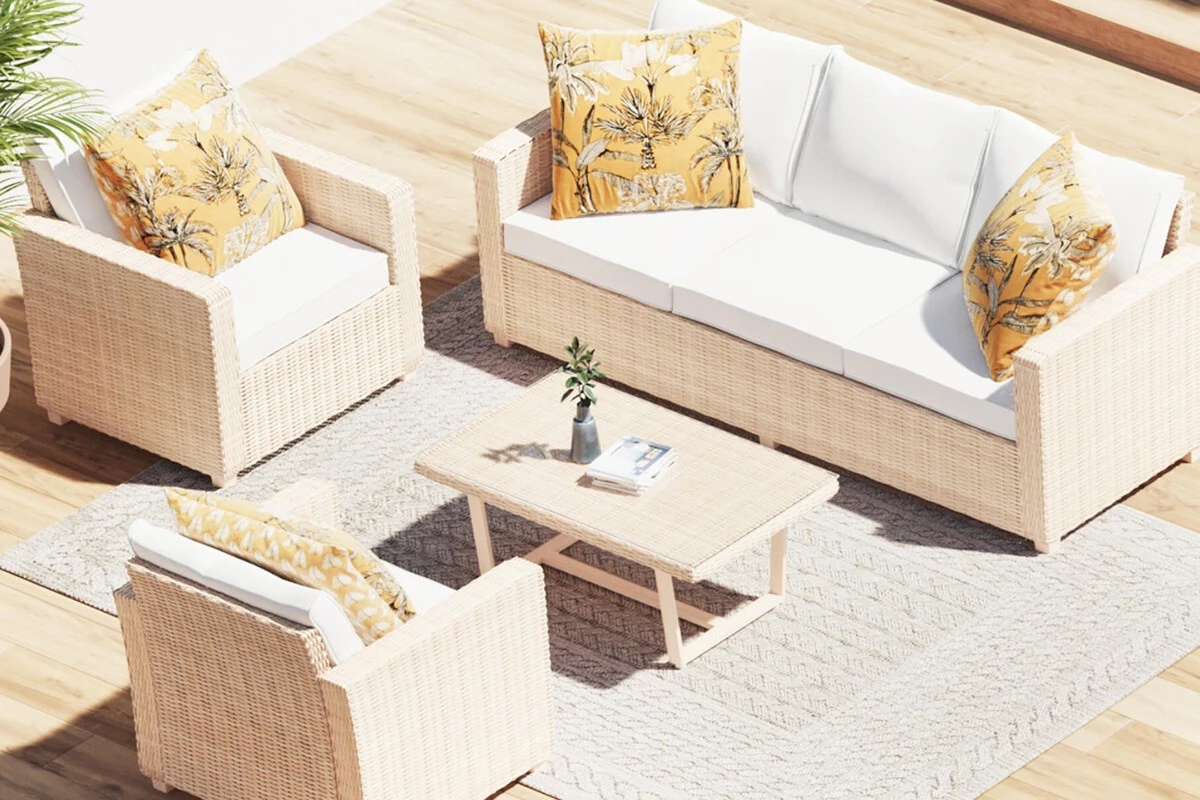 Este conjunto de muebles de exterior está compuesto por un sofá de tres plazas que tiene unas medidas de 199 x 79 x 79 cm, dos sillones individuales de 79 x 79 x 79 cm y una mesa baja de 100 x 40 x 60 cm de ancho, alto y fondo. Una opción ideal para disfrutar con total comodidad de reuniones de hasta 5 personas.